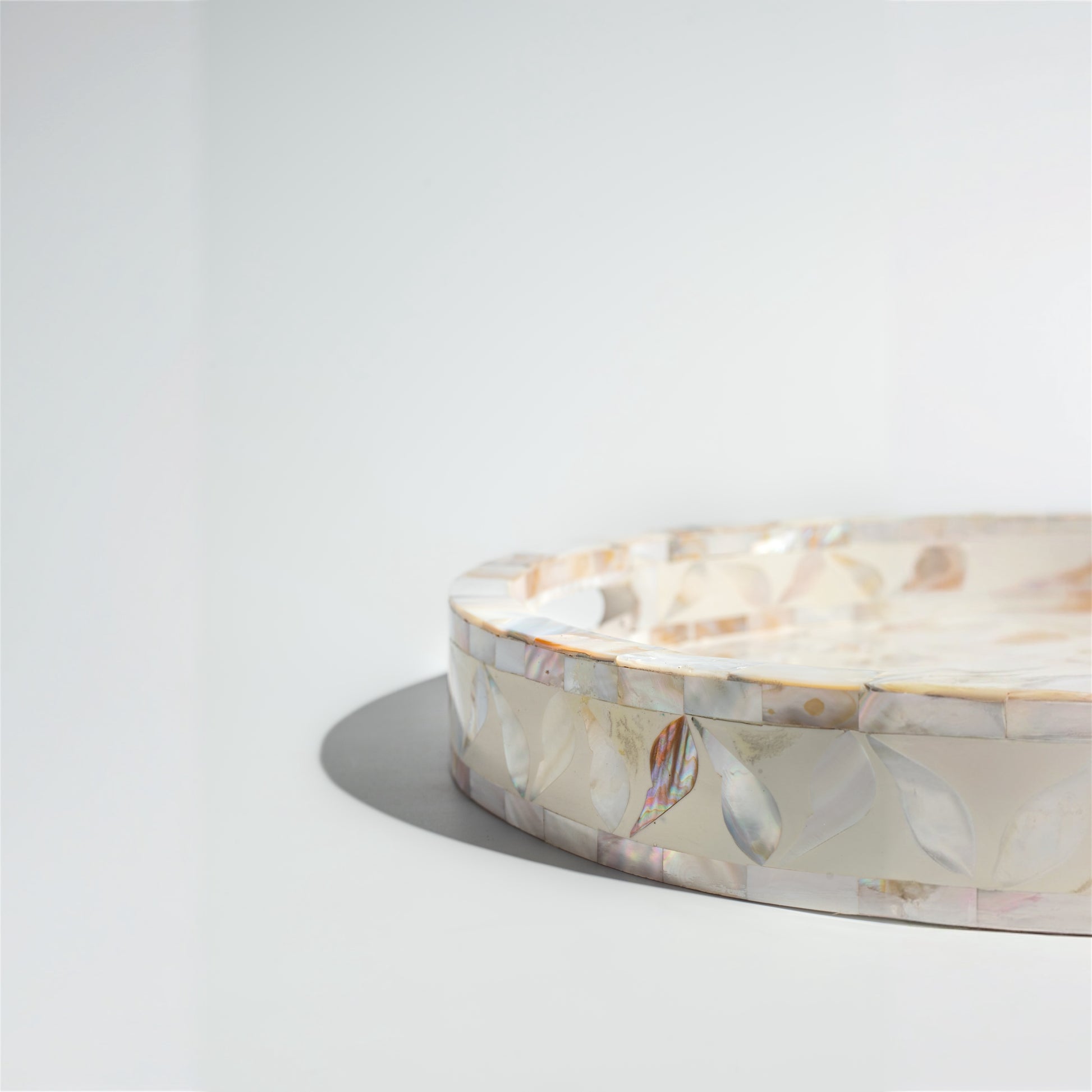 Soft, neutral, and endlessly elegant — this round tray in natural ivory tones is crafted with shimmering mother-of-pearl inlay. Each petal and leaf is hand-cut and placed with precision, reflecting light beautifully. A sophisticated addition to any space, perfect for layering candles, flowers, or accessories.
