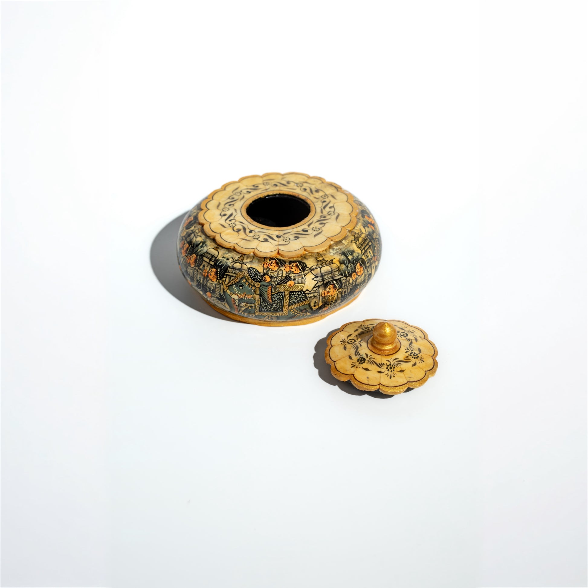 An exquisite handcrafted bone jar showcasing detailed hand-engraving and miniature art that tells stories of royal life and folklore. The scalloped edge and matching lid make it a timeless keepsake piece — perfect for coffee tables, dressers, or gifting.